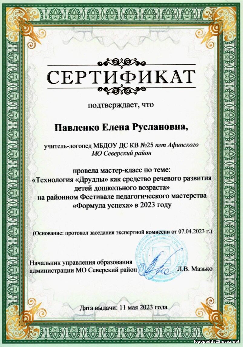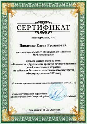 - Сертификат УО МО Северского района Протокол заседания экспертной комиссии от 07.04.2023 года подтверждающий проведение мастер класса на районном Фестивале педагогического мастерства "Формула успеха" в 2023 году.