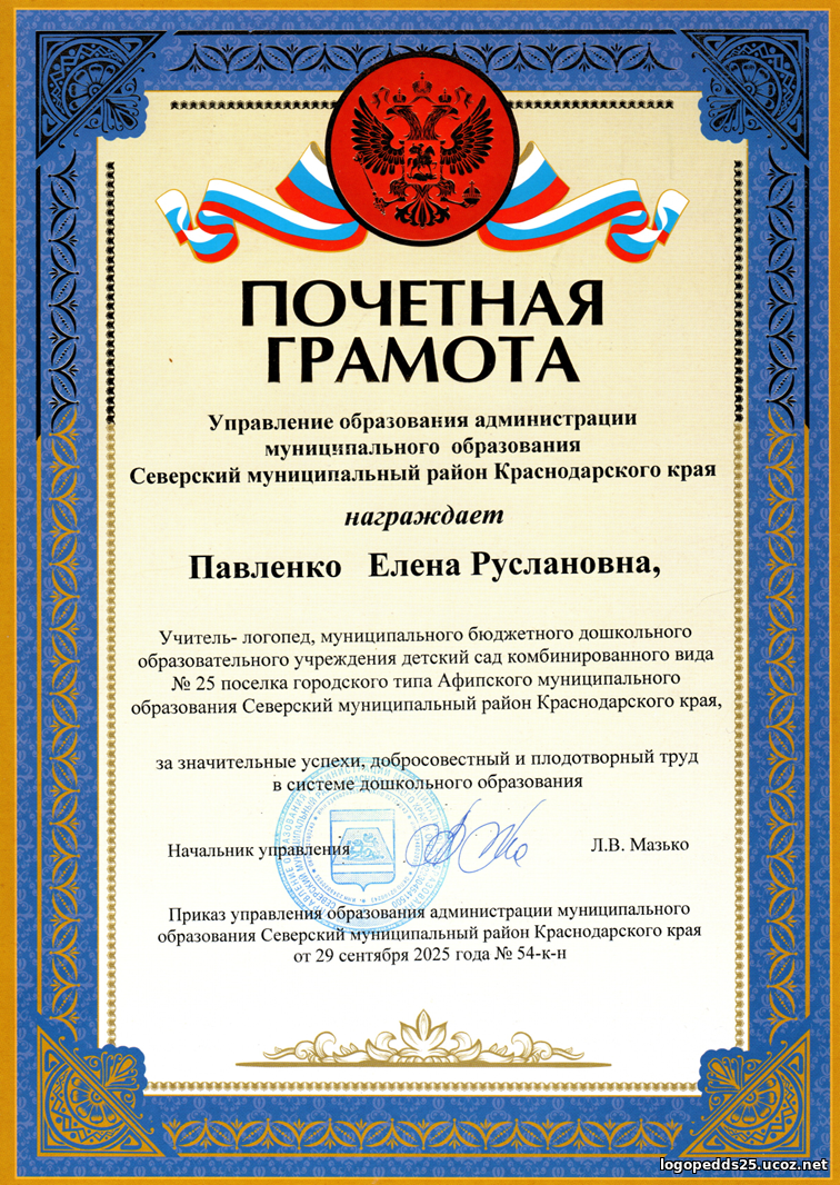 Должность, место работы: учитель-логопед МБДОУ ДС КВ № 25 МО Северский район