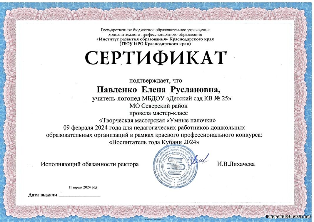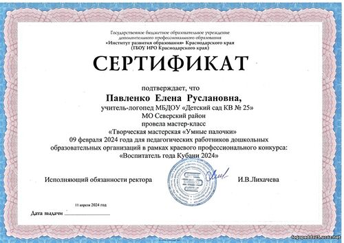 - Сертификат подтверждающий проведение мастер-класса "Творческая мастерская "Умные палочки" в рамках краевого профессионального конкурса: "Воспитатель года Кубани 2024"