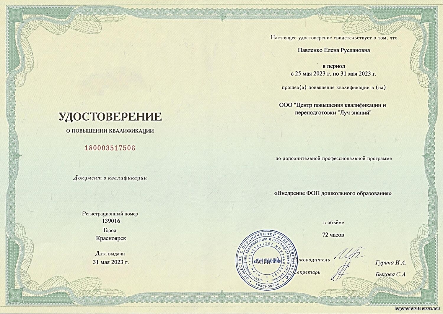 - "Внедрение ФОП дошкольного образования", с 25.05.2023 г. по 31.05.2023 г. /в объеме 72 часа/