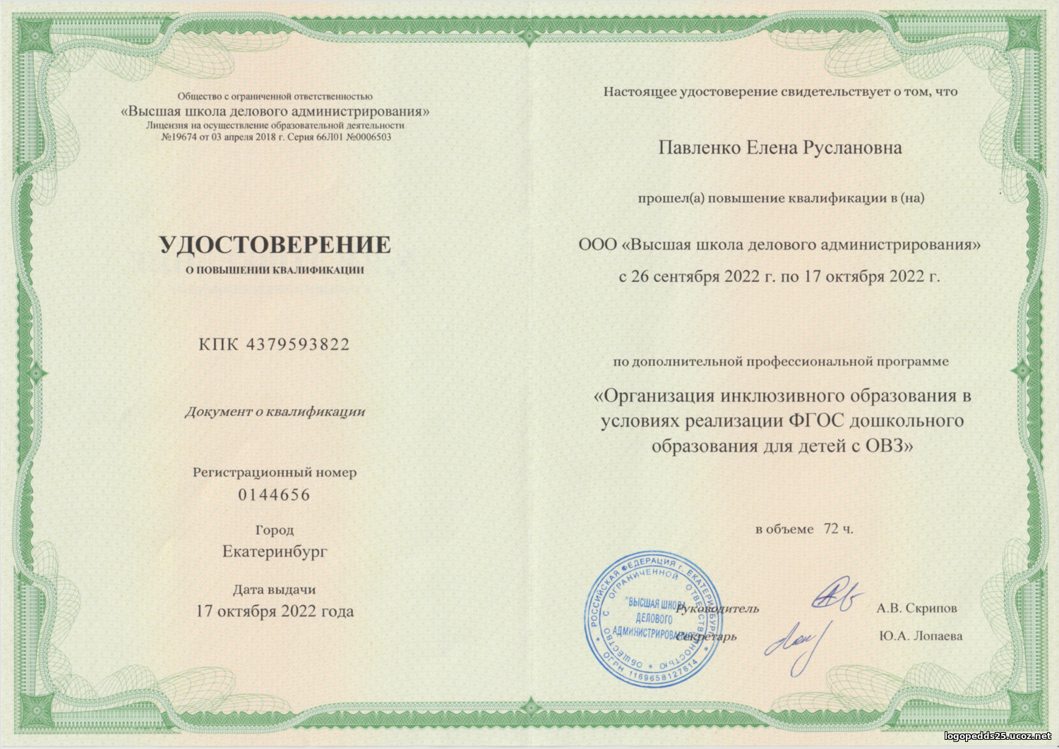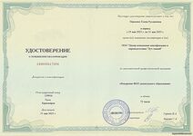 - "Организация инклюзивного образования в условиях реализации ФГОС дошкольного образования для детей с ОВЗ", с 26.09.2022 г. по 17.10.2022 г. /в объеме 72 часа/