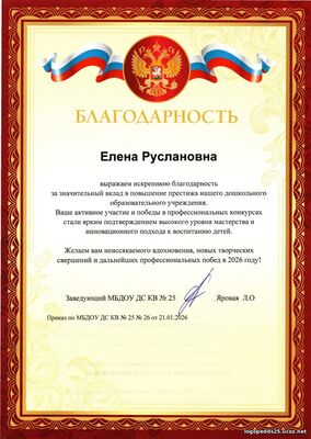 - Благодарность МБДОУ ДС КВ № 25 Приказ № 26 от 21.01.2026 года "За значимый вклад в повышение престижа дошкольного образовательного учреждения"