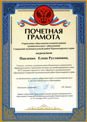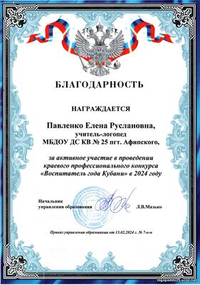 - Благодарственное письмо УО МО Северский район Приказ № 7-к-н от 13.02.2024 г. за активное участие в проведении кроаевого конкурса "Воспитатель года Кубани в 2024 году".