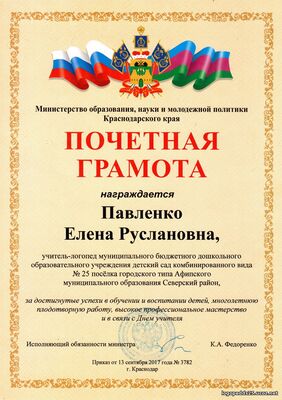 - Почетная грамота Министерства образования, науки и молодежной политики Краснодарского края, за достигнутые успехи в обучении и воспитании детей, многолетнюю плодотворную работу, высокое профессиональное мастерство и в связи с Днем учителя.