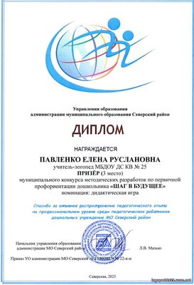 - Диплом призера муниципального конкурса методических разработок по первичной профориентации дошкольника "Шаг в будущее" в номинации: дидактическая игра.
